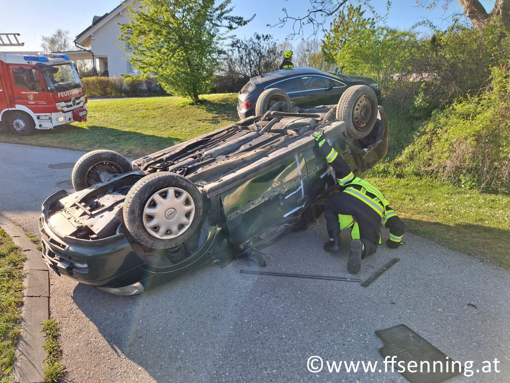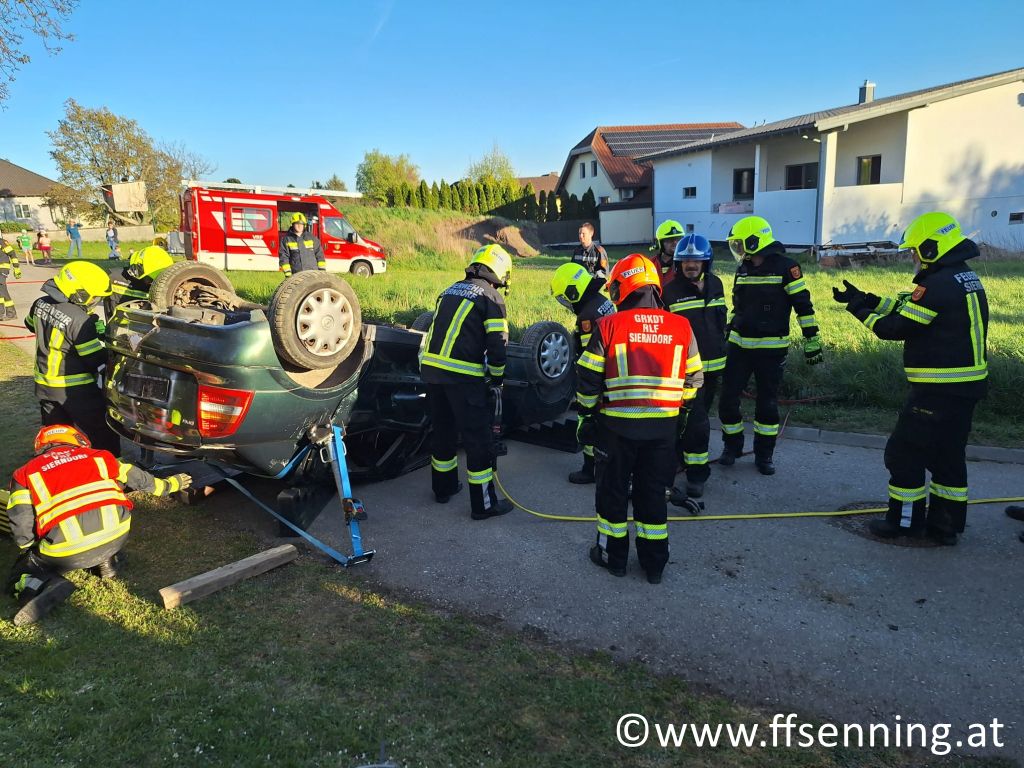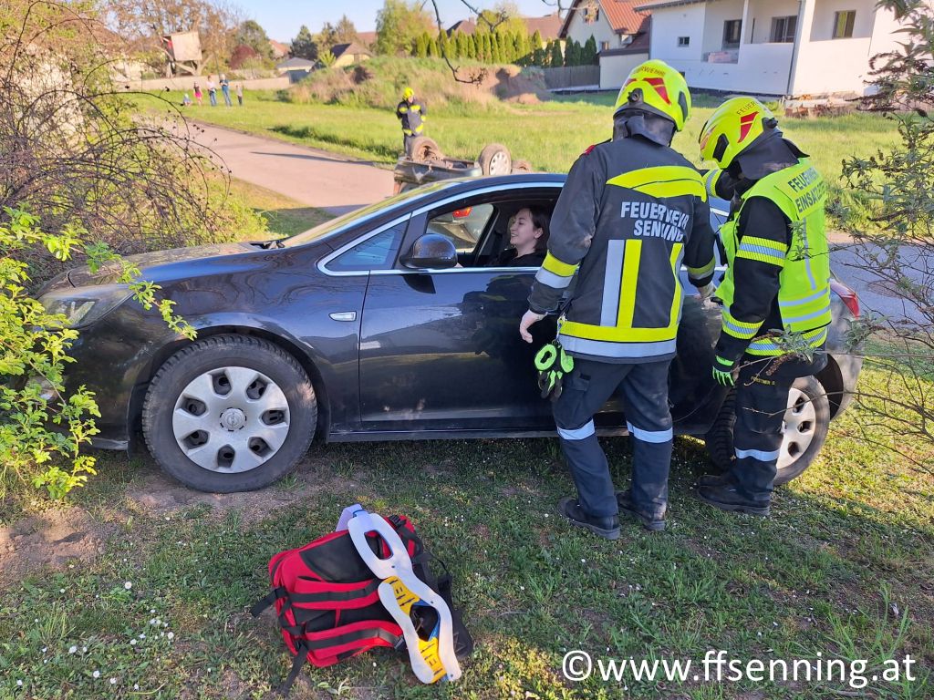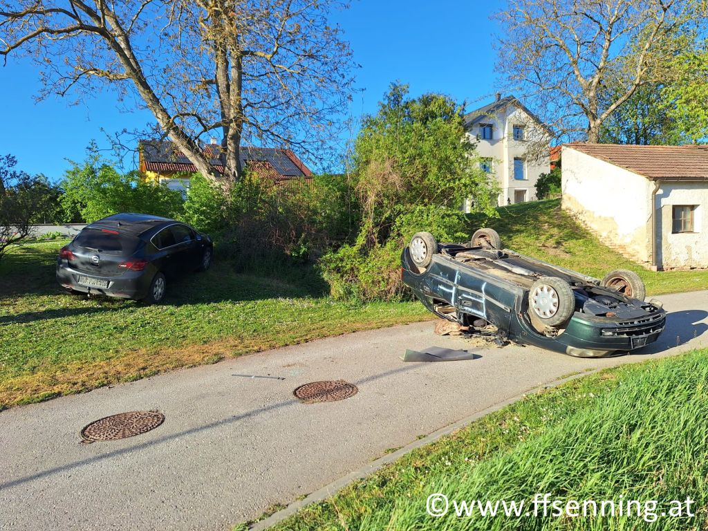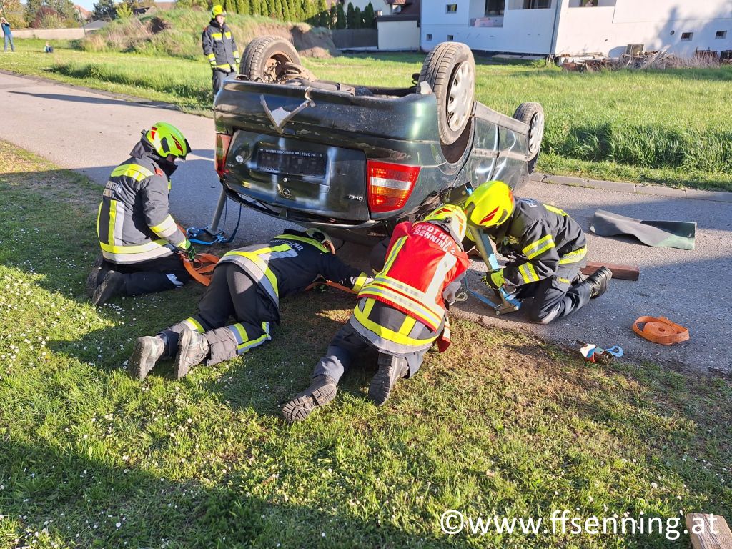 Ein Verkehrsunfall zwischen zwei Fahrzeugen. Ein Fahrzeug kam auf einer Böschung zum Stillstand, die Fahrerin klagte über Rückenschmerzen. Das zweite Fahrzeug lag am Dach, in diesem waren zwei Personen eingeklemmt.