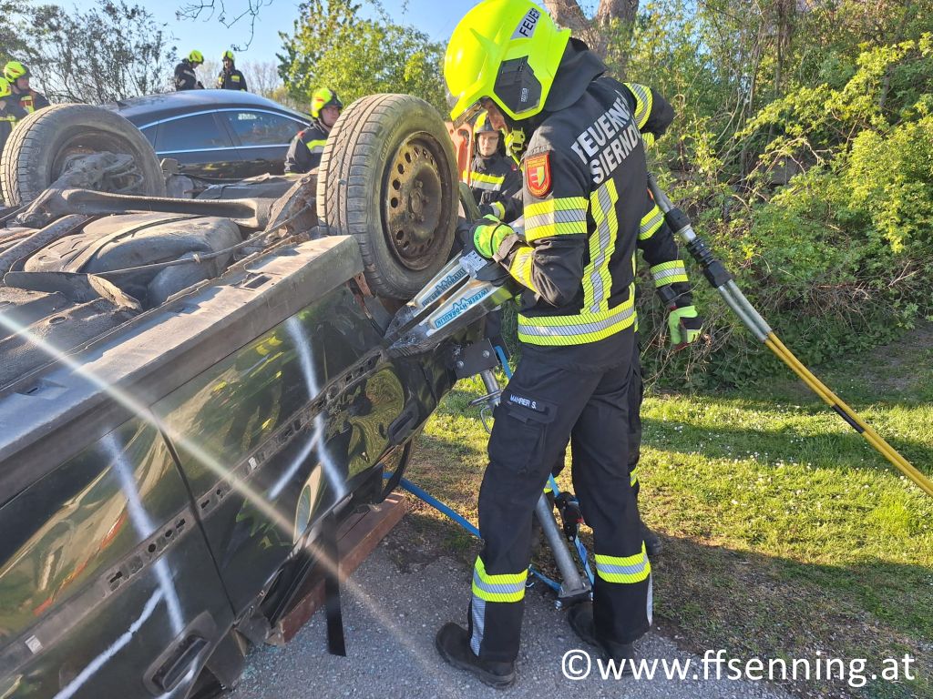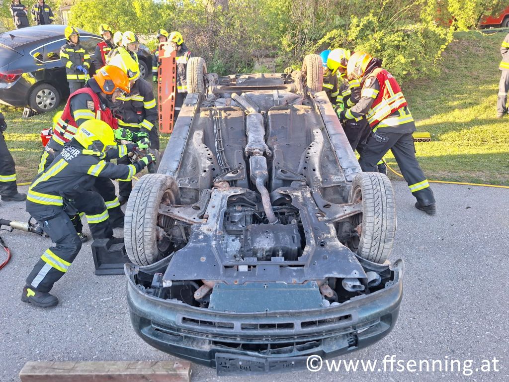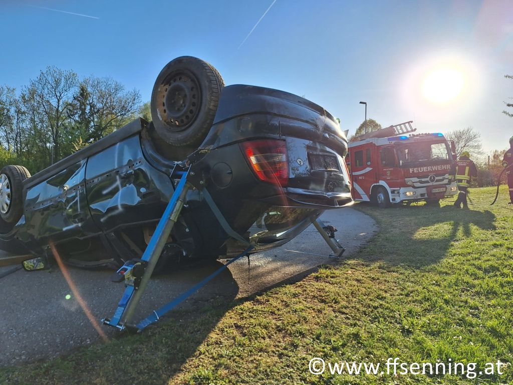Stabilisierung des auf dem Dach liegenden Fahrzeugs, sodass die nachrückenden Kräfte unmittelbar mit der Menschenrettung beginnen konnten.